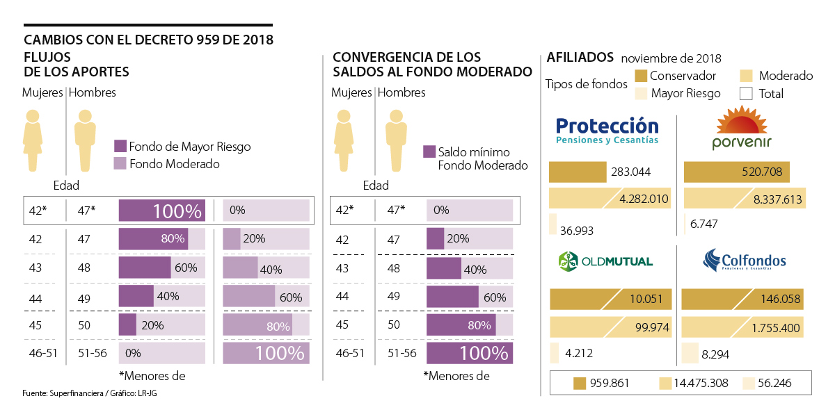 Desde el 5 de marzo de este año entró en vigencia el (Decreto 959 , 2018), por el cual se autoriza a las Administradoras de Fondos de Pensión-AFP a trasladar parte o la totalidad del ahorro pensional al fondo de mayor riesgo, claro siempre que el afiliado no escoja un fondo. La norma previa, planteaba que siempre que no se escogiera un fondo, el ahorro iría por defecto al fondo moderado, cosa que este decreto cambia sustancialmente. El otro elemento del decreto son los criterios de edad y sexo.